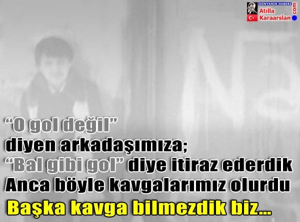 Yalnız ara sıra kavgalarımız olmadı değil, kavga ettik. Genelde kavgalarımız yolun ortasında iki taş ile belirlediğimiz çift kale maçlarda olurdu. Tam maçın en kritik anında bir araba gelirdi çekilirdik kenara hakem olmadığı için top sende, bende kavgamız olurdu. Veya “O gol değil”, “Bal gibi gol” diye kavgalarımız olurdu. Başka kavga bilmezdik biz…
