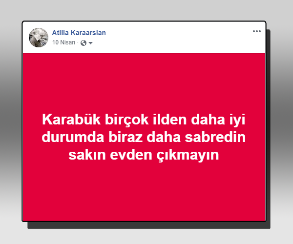 Bu başarıda emeği geçen başta sağlık emekçileri olmak üzere cadde, sokak, mahalle, işyeri, köy ve ilçeleri tek tek gezen halkı uyaran Karabük Valisi Fuat Gürel ve Emniyet Müdürü Sırrı Tuğ’a teşekkür ederim.